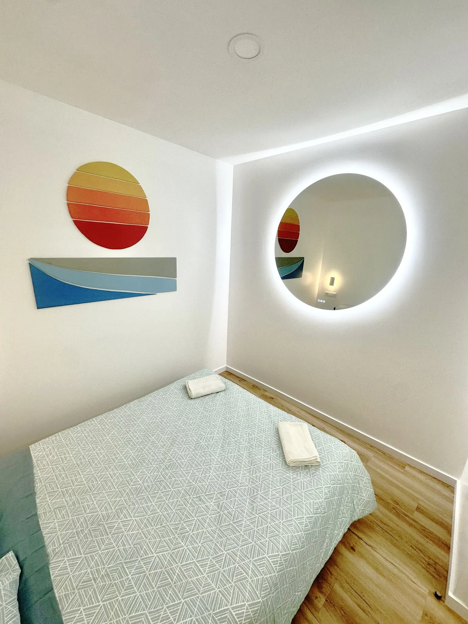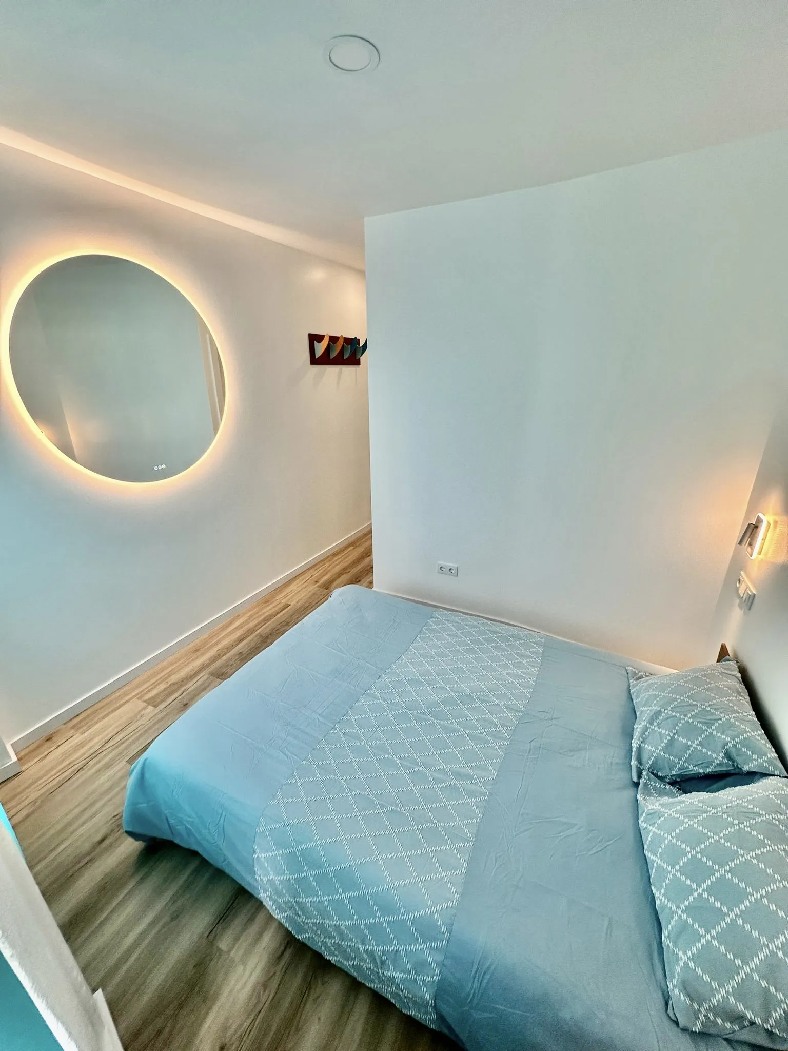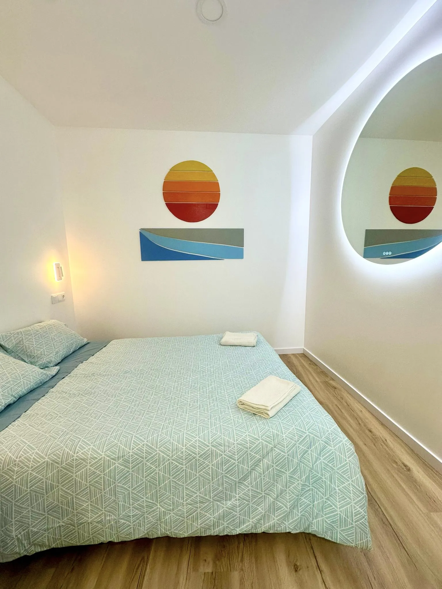 The room is furnished with a comfortable double bed, quality linens, and decorative touches inspired by the natural and relaxed atmosphere of the surf and Douro River.